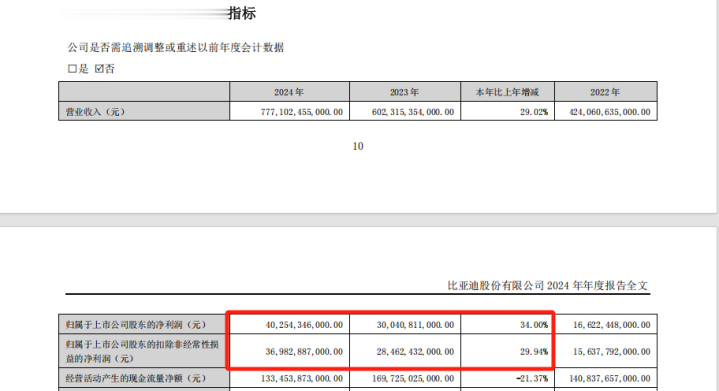 年报显示,2024年,比亚迪的营业收入为7771.02亿元,同比增长29.02%;归母净利润为402.54亿元,同比增长34%;扣非后净利润为369.83亿元,同比增长29.94%。