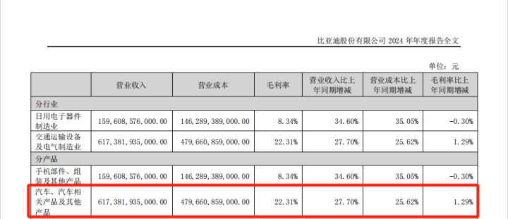 其中,比亚迪2024年从汽车业务获得的收入达6173.82亿元,同比增长27.70%;毛利率达22.31%,同比提升1.29个百分点。